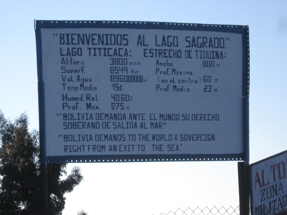 Welcome to the Sacred Lake, “Lago Titicaca” Published September 7, 2008 at 2048 × 1536 in Visit to Copacabana, Bolivia! ← Previous Next → Welcome to the Sacred Lake, “Lago Titicaca” A sign by the ferry boat crossing on Lake Titicaca in Bolivia. Lake Titicaca means “lake of the Grey Puma” in the local Indian languages spoken in Bolivia and Peru.